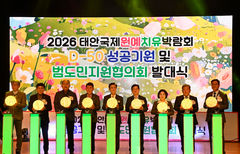 호반그룹은 지난 3일 김선규 호반그룹 회장이 지난 3일 충남 태안군 태안문화예술회관에서 열린 2026 태안국제원예치유박람회 D-50 성공 기원행사 및 범도민지원협의회 발대식에 참석했다고 4일 밝혔다. 이번 행사에는 김선규 호반그룹 회장, 김태흠 충남도지사, 가세로 태안군수 등 박람회 조직위원회 및 기관 관계자와 지역주민 등 800여 명이 참석했다.