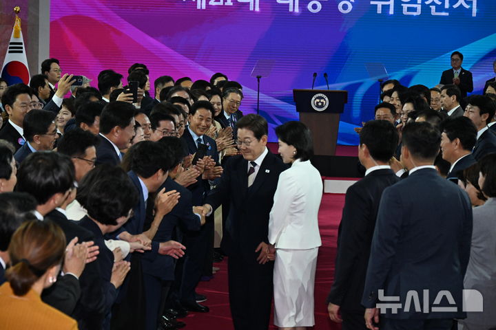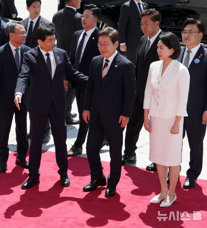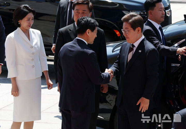 의원들과 인사하는 이재명 대통령-김혜경 여사