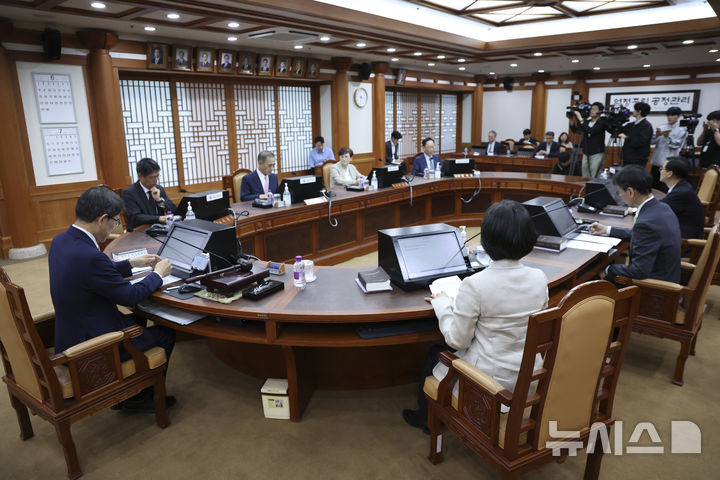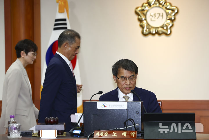 회의실 들어서는 노태악 선관위원장과 선관위원들