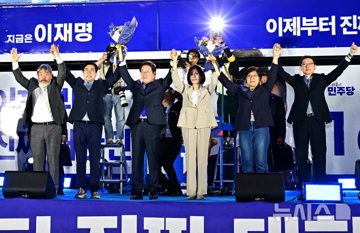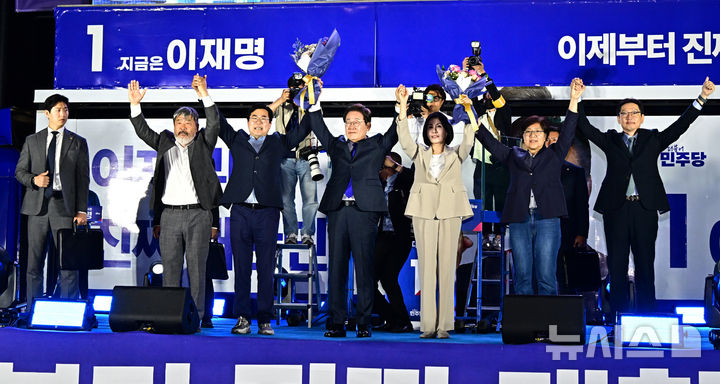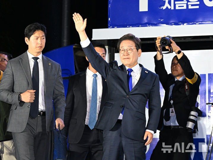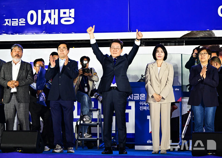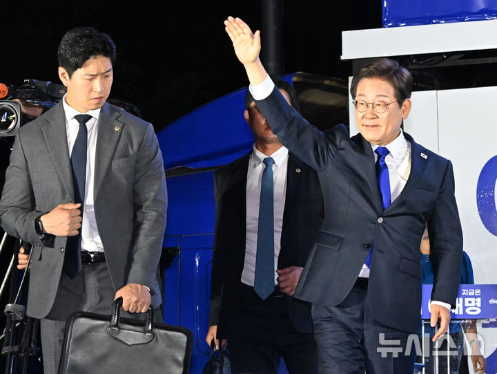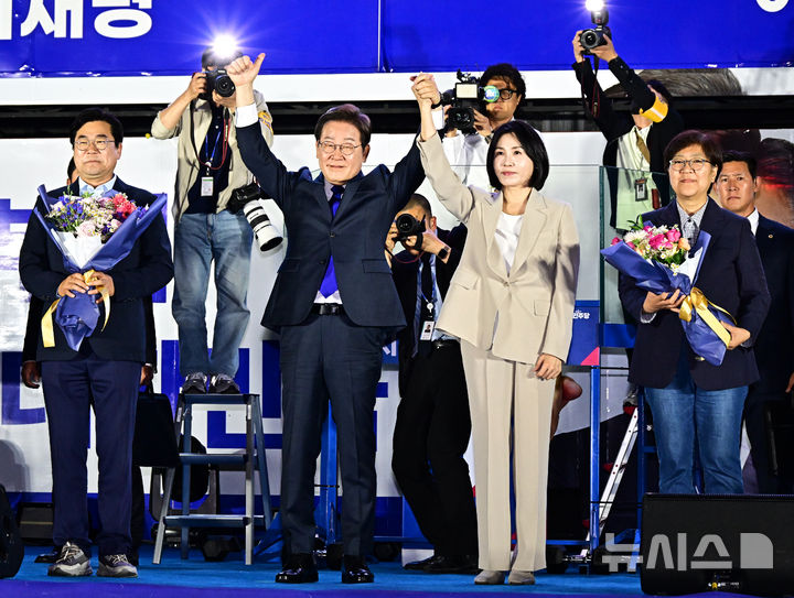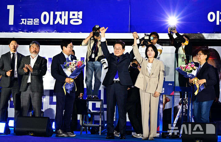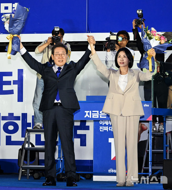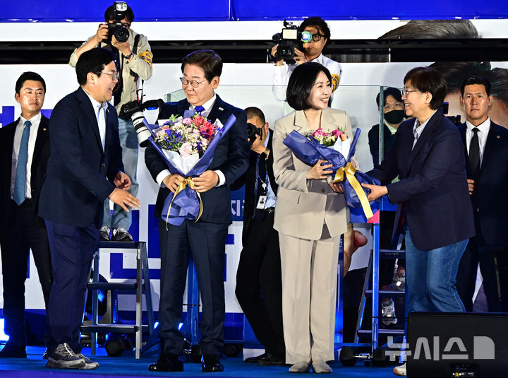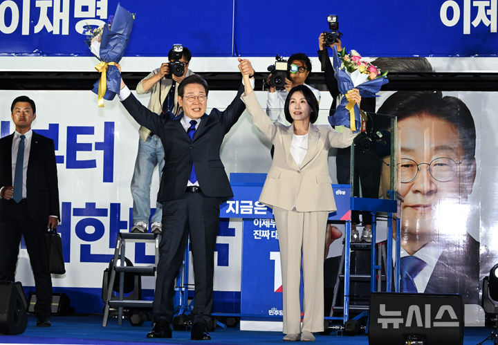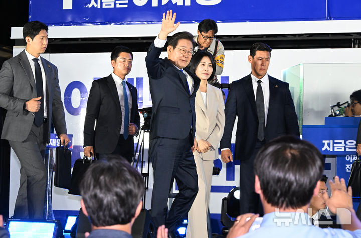 국민 개표방송 행사 참석하는 이재명 대통령 내외