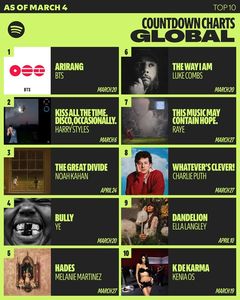 그룹 방탄소년단의 정규 5집 '아리랑'(ARIRANG)이 세계 최대 음원 플랫폼 스포티파이에서 프리세이브(사전 저장) 400만회를 돌파했다. 7일 소속사 빅히트뮤직에 따르면 '아리랑은 프리세이브 시작 이틀 만에 100만회를 넘긴 데 이어, 꾸준한 상승세를 이어가며 400만회를 기록했다. '아리랑'은 지난 4일 스포티파이 '카운트다운 차트 글로