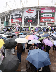 "눈꽃이 떨어져요 / 또 조금씩 멀어져요 / 보고 싶다 / 보고 싶다 / 얼마나 기다려야 / 또 몇 밤을 더 새워야 / 널 보게 될까 / 만나게 될까 ♪♬"('봄날' 중) 눈꽃 대신 강한 봄비가 내리는 9일 오후 경기 고양 고양종합운동장 주경기장 앞. 형형색색 우산을 든 글로벌 슈퍼 그룹 '방탄소년단'(BTS) 팬덤 '아미'들은 궂은