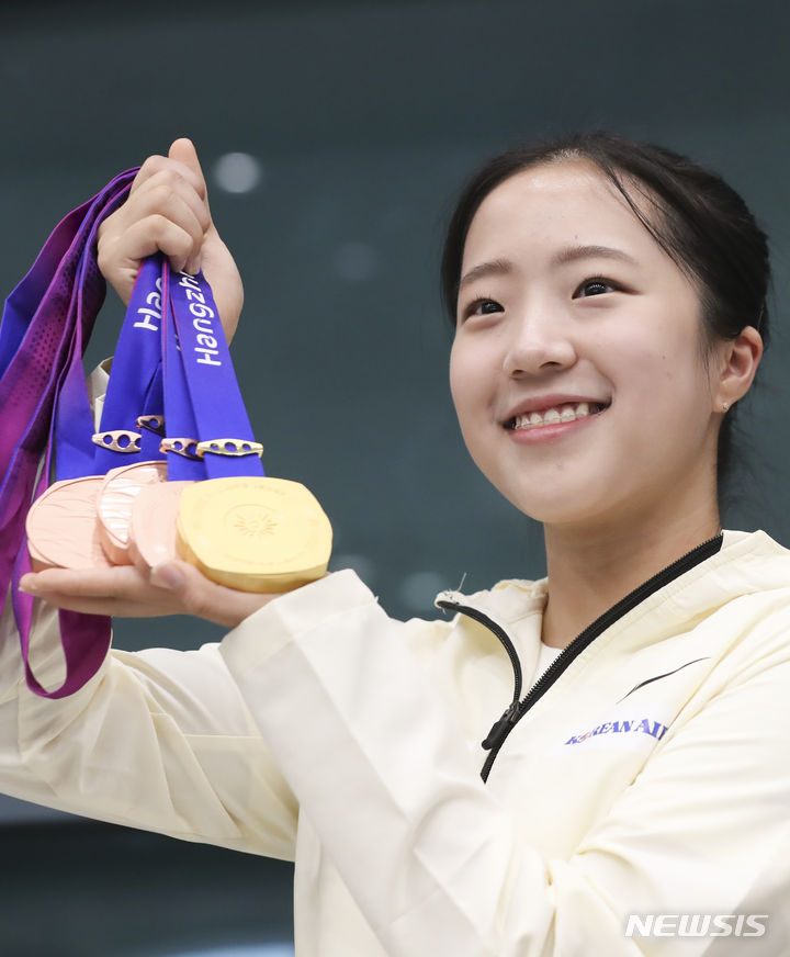 [인천공항=뉴시스] 김근수 기자 = 2022 항저우 아시안게임 대한민국 여자 탁구 대표팀 신유빈이 8일 인천국제공항 제1여객터미널 입국장에서 열린 환영행사에서 메달을 들어 보이고 있다. 2023.10.08. [email protected]