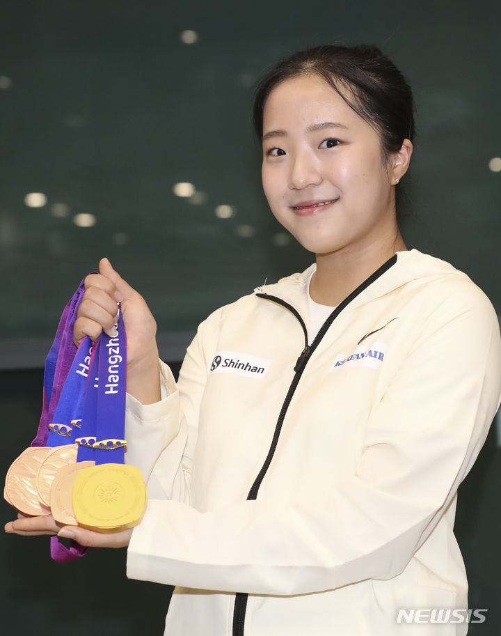[인천공항=뉴시스] 김근수 기자 = 2022 항저우 아시안게임 대한민국 여자 탁구 대표팀 신유빈이 8일 인천국제공항 제1여객터미널 입국장에서 열린 환영행사에서 메달을 들어 보이고 있다. 2023.10.08. [email protected]