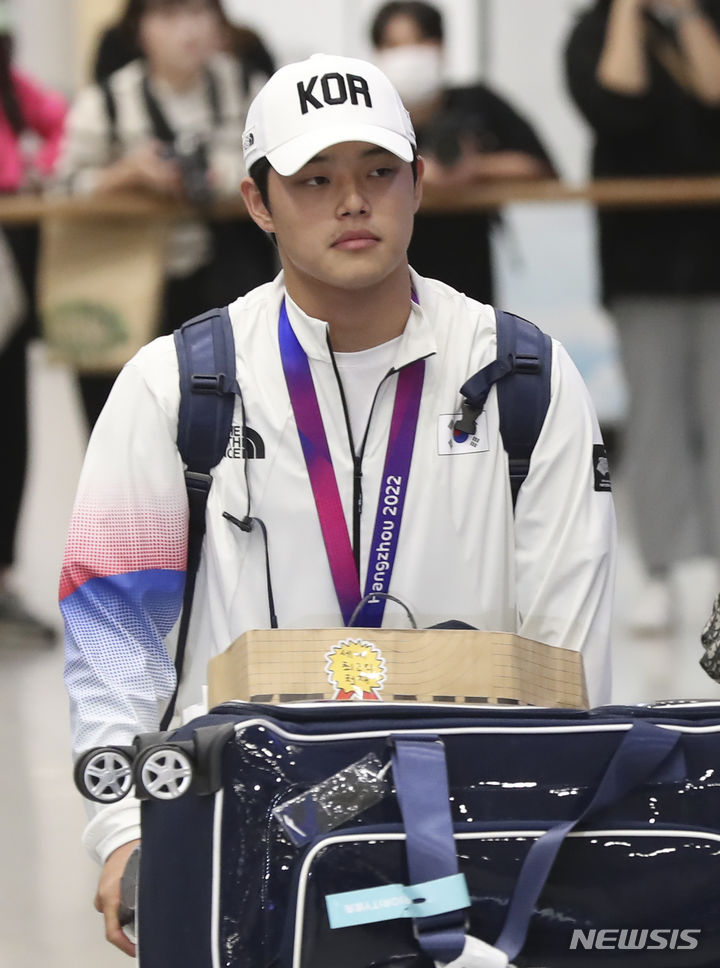 [인천공항=뉴시스] 김근수 기자 = 2022 항저우 아시안게임 대한민국 남자 야구 대표팀 문동주가 8일 인천 중구 인천국제공항 제1여객터미널 입국장을 통해 귀국하고 있다. 2023.10.08. [email protected]