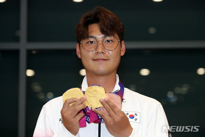 [인천공항=뉴시스] 김근수 기자 = 제19회 항저우 아시안게임 남자 양궁 이우석이 8일 오후 인천국제공항을 통해 귀국해 메달을 들고 기념촬영하고 있다. 양궁 남자 리커브 이우석은 남자 단체전, 혼성전에서 금메달 2개, 개인전에서 동메달 1개를 따냈다. 2023.10.08. [email protected]