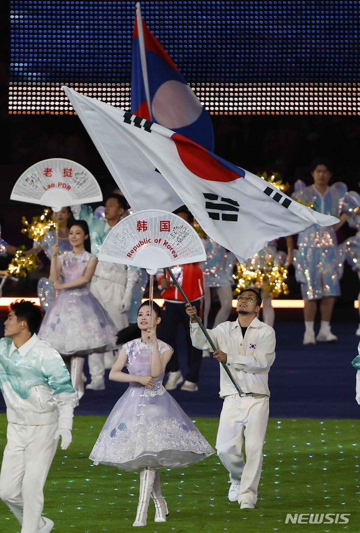 [항저우=뉴시스] 정병혁 기자 = 8일 중국 항저우 올림픽스포츠센터 스타디움에서 열린 2022 항저우 아시안게임 폐회식에 브레이킹 국가대표 김홍열이 태극기를 들고 입장하고 있다. 2023.10.08. [email protected]