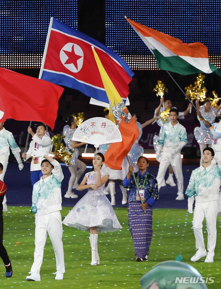 [항저우=뉴시스] 정병혁 기자 = 8일 중국 항저우 올림픽스포츠센터 스타디움에서 열린 2022 항저우 아시안게임 폐회식에 북한의 인공기가 들어오고 있다. 2023.10.08. [email protected]