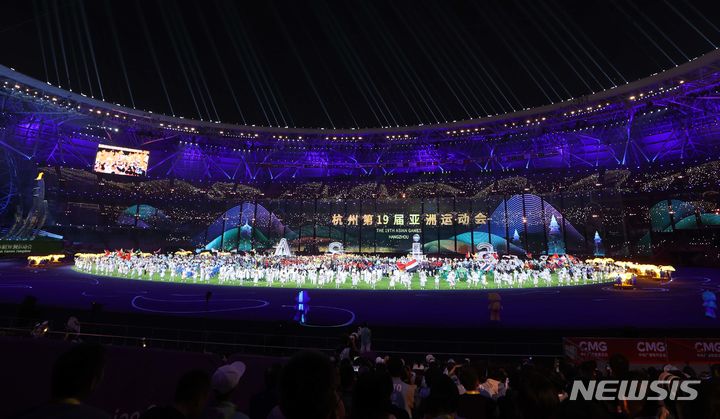 [항저우=뉴시스] 고승민 기자 = 8일 중국 항저우 올림픽스포츠센터 스타디움에서 열린 2022 항저우 아시안게임 폐막식, 각국 참가자들이 한데 모여 기쁨을 나누고 있다. 2023.10.08. [email protected]