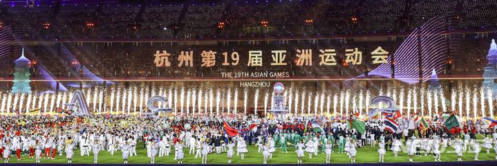 [항저우=뉴시스] 정병혁 기자 = 8일 중국 항저우 올림픽스포츠센터 스타디움에서 열린 2022 항저우 아시안게임 폐회식에 각 국 국가대표 선수들이 입장해 있다. 2023.10.08. [email protected]