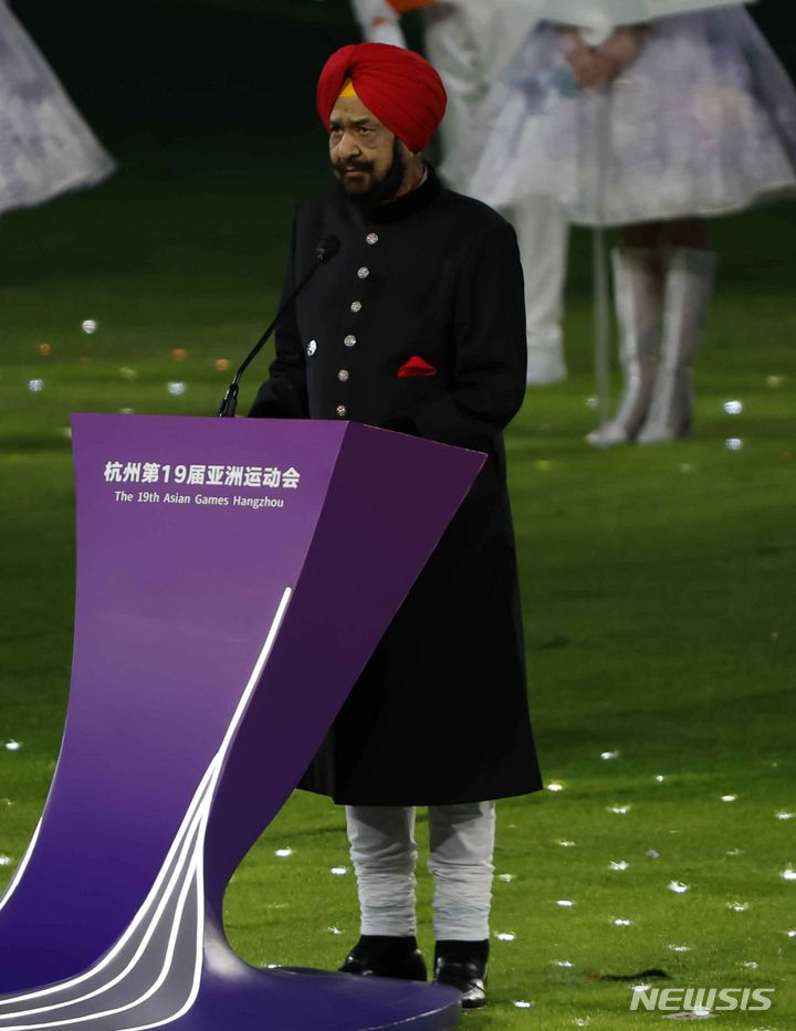 [항저우=뉴시스] 정병혁 기자 = 8일 중국 항저우 올림픽스포츠센터 스타디움에서 열린 2022 항저우 아시안게임 폐회식에서 라자 란다르 싱 국제올림픽위원회 명예위원이 연설하고 있다.. 2023.10.08. [email protected]