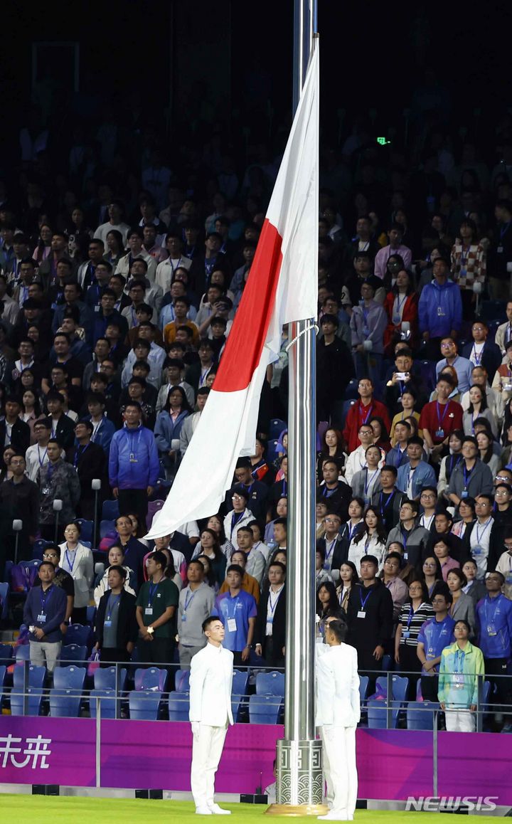 [항저우=뉴시스] 정병혁 기자 = 8일 중국 항저우 올림픽스포츠센터 스타디움에서 열린 2022 항저우 아시안게임 폐회식에서 일본의 일장기가 게양되고 있다. 2023.10.08. [email protected]
