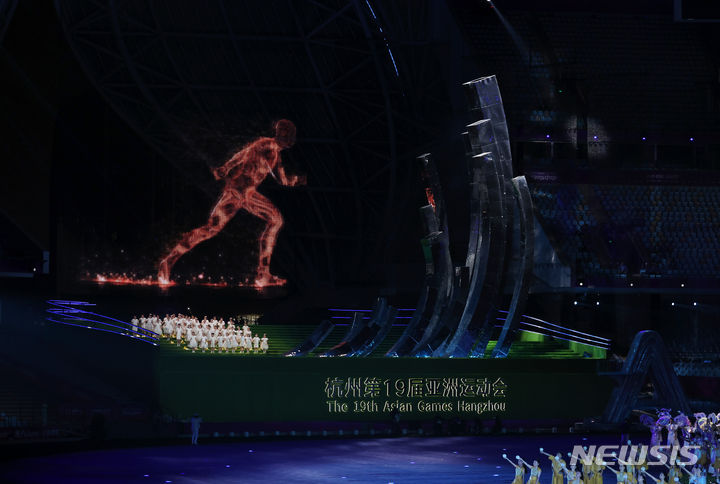 [항저우=뉴시스] 고승민 기자 = 8일 중국 항저우 올림픽스포츠센터 스타디움에서 열린 2022 항저우 아시안게임 폐막식에서 갈라 공연이 펼쳐지고 있다. 성화가 소화되고 있다. 2023.10.08. [email protected]