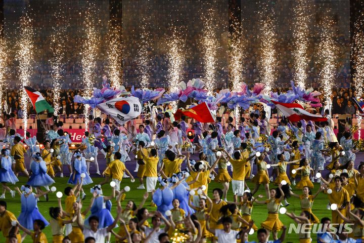 [항저우=뉴시스] 정병혁 기자 = 8일 중국 항저우 올림픽스포츠센터 스타디움에서 2022 항저우 아시안게임 폐회식 피날레 공연이 펼쳐지고 있다. 2023.10.08. [email protected]