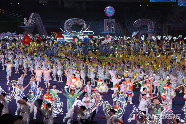 [항저우=뉴시스] 고승민 기자 = 8일 중국 항저우 올림픽스포츠센터 스타디움에서 열린 2022 항저우 아시안게임 폐막식에서 매스 게임이 펼쳐지고 있다. 2023.10.08. [email protected]