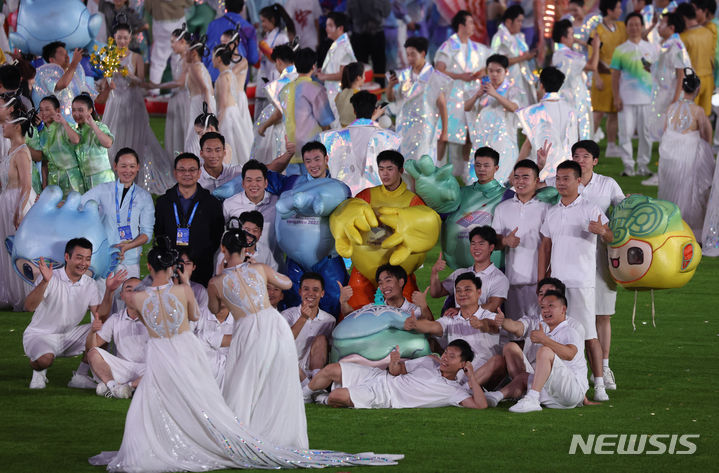 [항저우=뉴시스] 고승민 기자 = 8일 중국 항저우 올림픽스포츠센터 스타디움에서 열린 2022 항저우 아시안게임 폐막식 후 공연 단원들이 기념촬영을 하고 있다. 2023.10.08. [email protected]