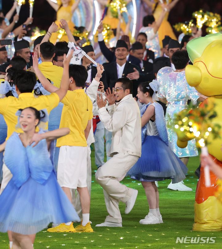 [항저우=뉴시스] 조수정 기자 = 2022 항저우 아시안게임 폐막식이 열린 8일 중국 항저우 올림픽스포츠센터 스타디움에서 한국 선수단 기수로 브레이킹 은메달을 획득한 비보이 김홍열(Hong10)이 춤을 추고 있다. 2023.10.08. [email protected]