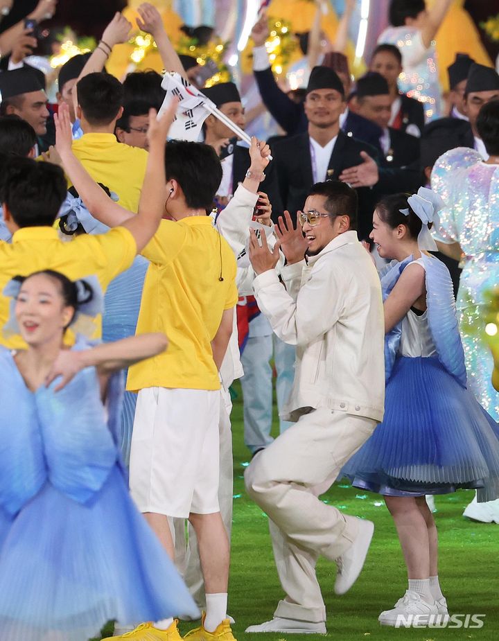 [항저우=뉴시스] 조수정 기자 = 2022 항저우 아시안게임 폐막식이 열린 8일 중국 항저우 올림픽스포츠센터 스타디움에서 한국 선수단 기수로 브레이킹 은메달을 획득한 비보이 김홍열(Hong10)이 춤을 추고 있다. 2023.10.08. [email protected]