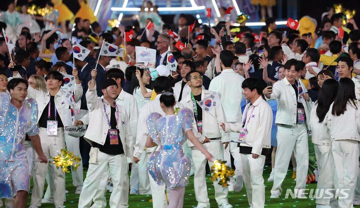 [항저우=뉴시스] 조수정 기자 = 2022 항저우 아시안게임 폐막식이 열린 8일 중국 항저우 올림픽스포츠센터 스타디움에서 한국 선수단이 기념촬영 하고 있다. 2023.10.08. [email protected]