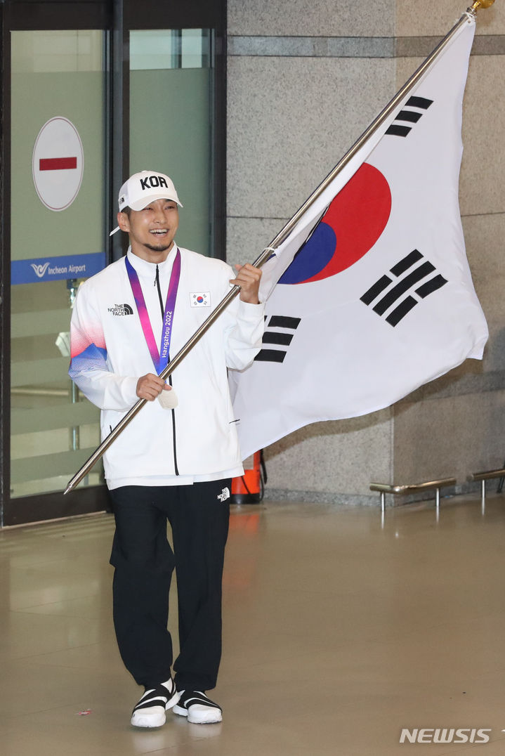 [인천공항=뉴시스] 황준선 기자 = 2022 항저우 아시안게임 브레이크 댄스에서 은메달을 딴 김홍열이 9일 오후 인천국제공항 제1여객터미널 입국장을 통해 귀국하고 있다. 2023.10.09. [email protected]