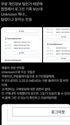 쿠팡 대규모 개인정보 유출 사태 이후, 소셜미디어 X(구 트위터)에서 쿠팡 앱 로그인 기록에 'Unknown(알 수 없는)' 기기 접속이 표시된다는 이용자들의 제보가 잇따르고 있다. 지난달 30일 X에는 '쿠팡 로그인 기록 한번씩 확인해보세요'라는 글이 작성자가 직접 캡처했다는 로그인 기록 화면과 함께 퍼지며 화제를 모았다. 작성자는 &qu