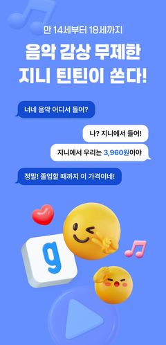 KT지니뮤직은 음원 플랫폼 업계 최초로 10대 음악 이용권 '지니 틴틴'을 출시했다고 12일 밝혔다. 이 멤버십은 14세부터 18세까지의 청소년이 정상가(8140원) 대비 51% 할인된 월 3960원(웹 결제 기준)으로 무제한 음악 스트리밍을 이용할 수 있도록 설계됐다. 19세 생일이 되면 이용료는 정상가인 8140원으로 자동 전환된다. 지