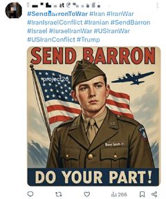 도널드 트럼프 미국 대통령의 막내아들인 배런 트럼프의 입대를 촉구하는 해시태그가 미국 사회관계망서비스(SNS)에서 확산하고 있다. 3일(현지 시간) 미국 온라인 뉴스 매체 데일리비스트에 따르면 미국과 이스라엘의 대이란 군사작전으로 미군 사망자가 발생하자 일부 미국 누리꾼들 상에서는 "전쟁이 정당하다면 대통령의 아들도 참전해야 하는 것 아니