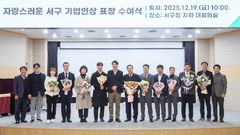 인천 서구는 최근 구청 대회의실에서 '2025년 자랑스러운 서구 기업인상' 수상자 10명에게 표창을 수여했다고 22일 밝혔다. 서구는 지역 내 기업인의 자긍심 고취와 사기 진작을 위해 탁월한 경영 능력으로 기업의 경쟁력을 높이고 지역사회 발전에 기여한 모범기업인 10명을 선정했다. 이번 수상자는 ▲㈜세일공조 유시훈 대표 ▲㈜우앤이 우춘택 대표 ▲