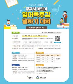 경기 광주시는 내년에 '제1회 광주시 어린이 영어 독후감 말하기 대회'를 연다고 19일 밝혔다. 참가 접수는 이달 29일부터 내년 1월16일까지 진행한다. 참가 대상은 광주시 지역 내 초등학교 재학생 1~6학년 또는 광주시 거주 홈스쿨링 아동(2013년~2018년생)이며, 출생부터 현재까지 영어권 국가에 2년 이상 거주한 아동은 참가를