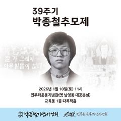 경기 의왕시 민주화운동기념사업회는 오는 10일 박종철 기념사업회와 공동으로 '고 박종철 열사 39주기 추모제'를 연다고 9일 밝혔다. 오전 11시부터 민주화 운동기념관(옛 남영동 대공분실)에서 진행한다. 이번 추모제는 박종철 열사 고문치사 사건이 발생한 옛 남영동 대공분실에서 진행되는 공식 추모 행사로, 사전 공연을 시작으로 추모사, 추모 공연,