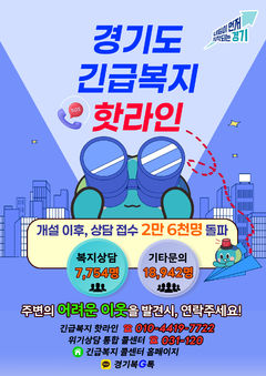 경기도는 위기도민 발굴을 위해 '긴급복지 핫라인'을 운영한 결과 3년 3개월 만에 상담 접수 2만6000명을 넘어섰다고 22일 밝혔다. 도는 복지 사각지대에서 세상을 떠난 '수원 세 모녀' 사건 이후 2022년 8월25일 긴급복지 핫라인(010-4419-7722)과 위기상담 통합 콜센터(031-120)를 신설했다. 경기복G톡, 경기도 긴급복지 누리
