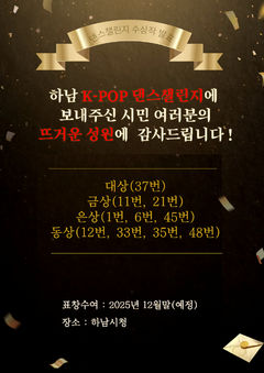 경기 하남시는 시민들을 대상으로 진행된 ‘하남 K-POP 댄스 챌린지’ 최종심사 결과 대상에 초등학생팀인 '트윙클'이 선정됐다고 1일 밝혔다. 시는 지난 10월 열린 '글로벌 K-POP 댄스 챌린지'의 열기를 이어가기 위해 시민들이 직접 댄스 챌린지 영상을 찍어 유튜브를 통해 참여하는 후속행사를 진행해왔다. 총 52개 팀이 참여한 이번 챌린지
