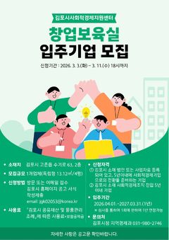 경기 김포시는 초기 사회적경제기업의 안정적인 운영 및 성장을 지원하기 위해 이달 11일까지 사회적경제지원센터 창업보육실 입주 기업을 모집한다고 3일 밝혔다. 이번 모집은 공고일 기준 시 소재 창업 5년 이내 사회적경제기업으로 전환을 준비하는 기업 또는 진입 5년 이내 사회적경제기업을 대상으로 한다. 1곳을 선정하며, 사회적가치, 지