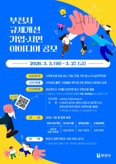 경기 부천시는 이달 27일까지 '2026년 규제개선 기업·시민 아이디어 공모'를 추진한다고 3일 밝혔다. 공모는 규제개선에 관심 있는 기업, 단체, 개인 누구나 거주지 제한 없이 참여할 수 있다. 분야는 별도 제한 없이 생활 속 불편 사항, 기업 활동을 저해하는 행정규제, 지역 발전을 지연시키는 개발규제 등 전 분야 개선 과제를 대상으로 한다