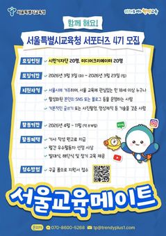 서울시교육청이 홍보 서포터즈 '서울교육메이트' 4기를 23일까지 모집한다고 16일 밝혔다. 시민 입장에서 다양한 주제와 형식으로 서울교육의 정책과 정보를 개성 있게 제작해 확산한다는 취지다. 만 18세 이상 서울시민 중 본인의 소셜미디어(블로그, SNS)를 운영하며 영상 제작 및 활용 능력을 갖춘 사람이라면 누구나 지원할 수 있다.
