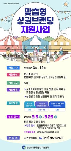 인천시는 지역 상권의 특성과 경쟁력을 진단하고, 상권별 맞춤형 전략을 수립하기 위한 브랜딩 지원사업을 올해 처음으로 추진한다고 8일 밝혔다. 선정된 상권에는 상권 진단, 핵심 콘셉트 도출, 브랜드 전략 수립 등을 지원하며, 상권별 특성을 반영한 브랜드북도 제작할 예정이다. 지원 대상은 인천소재 전통시장, (골목형) 상점가, 골목상권 공동체 등이다