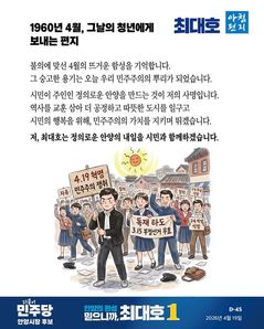 최대호 더불어민주당 경기 안양시장 후보가 제66주년 4·19 혁명 기념일을 맞아 "불의에 맞선 숭고한 용기를 계승해 정의로운 안양을 만들겠다"는 강력한 의지를 밝혔다. 최 후보는 19일 자신의 SNS를 통해 "불의에 맞섰던 4월의 뜨거운 함성을 기억한다"며, "그날의 숭고한 용기는 오늘날 대한민국 민주주