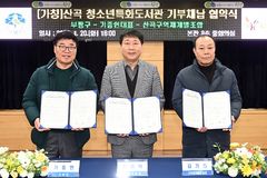 인천 부평구는 지난 20일 구청 중회의실에서 '산곡 청소년특화도서관(가칭) 건립을 위한 기부채납 업무협약식'을 열었다고 21일 밝혔다. 3자 간 협약으로 진행된 이번 협약식에는 차준택 부평구청장, 기중현 힐링웨이 대표, 김기찬 산곡재개발조합장 등이 참여했다. 협약에 따라 기부자는 도서관을 건축하고 부평구는 행정적 지원을, 재개발조합은 도서관 부지