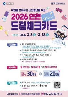 인천시는 미취업 청년의 구직활동을 지원하는 '드림체크카드 사업' 참여자를 18일까지 모집한다고 2일 밝혔다. '드림체크카드'는 경제적으로 어려움을 겪고 있는 미취업 청년에게 구직활동비를 지원해 생활 안정을 돕고 취업을 촉진하기 위해 2019년부터 인천시가 추진해 온 사업이다. 2025년까지 총 4483명의 청년이 지원을 받았으며, 지난해 참여자