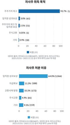 최근 5년간 국내 상장사들의 약 20%가 매년 자사주 매입에 나섰지만 이중 실제 소각까지 이행한 기업은 30%선에 그친 것으로 나타났다. 특히 기업들이 자사주 취득 목적으로 대부분 '주주가치 제고'를 내세웠지만 정작 처분 단계에서는 임직원 보상이나 자금 확보 용도가 압도적으로 높았다. 2일 리더스인덱스에 따르면 상장사 2658개를 대상으로 최