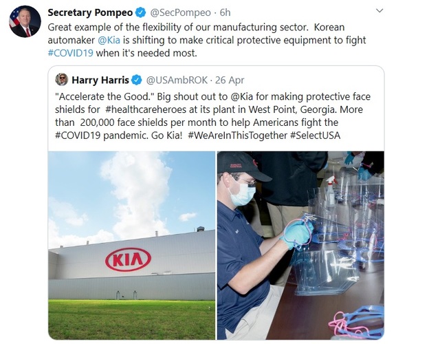 美국무 "기아차 美공장, 코로나19 보호장비 생산 대단"