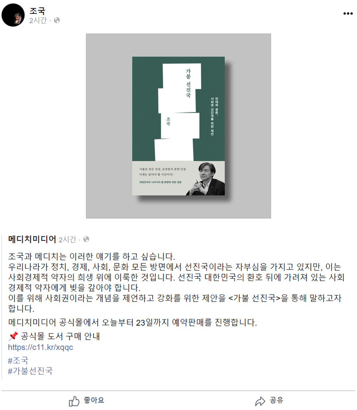 조국, 尹 당선 후 8일 만에 SNS 재개...저서 '가불 선진국' 홍보
