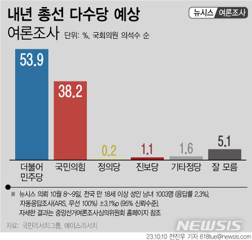 내년 총선 다수당…국민의힘 38.2% 민주당 53.9%