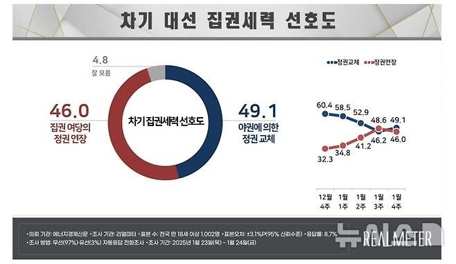 정권교체 49.1%·정권연장 46.0%…국힘 45.4%·민주 41.7%[리얼미터]