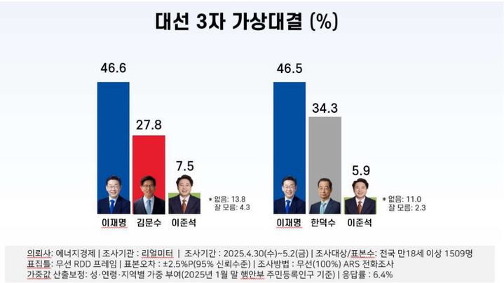 보수 단일후보 적합도, 한덕수 30%·김문수 21.9%…3자 대결시 이재명 가장 앞서[리얼미터]