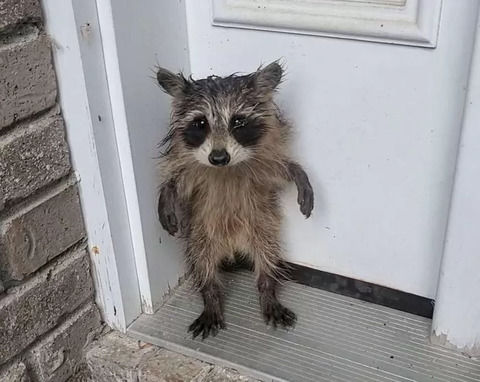"문 좀 열어주세요"…현관문 앞 비 홀딱 젖은 아기 라쿤