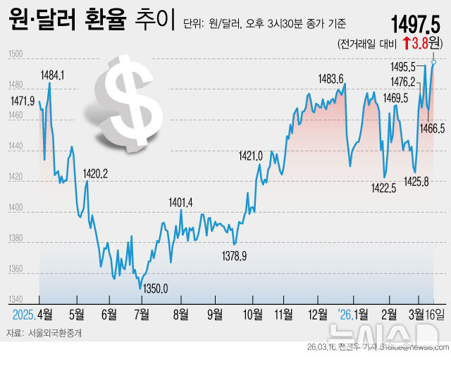[그래픽] 원·달러 환율 장중 1500원 돌파…1497.5원 마감