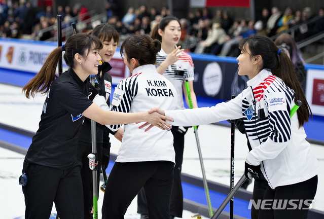 패자와 악수하는 한국 컬링 대표팀