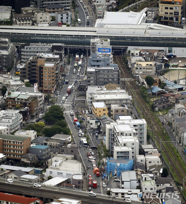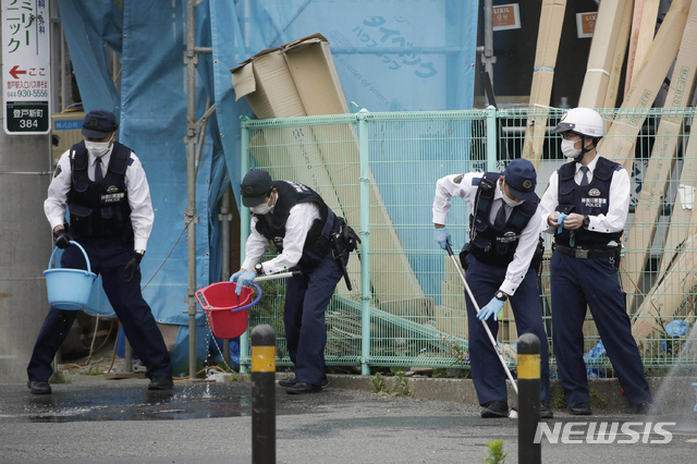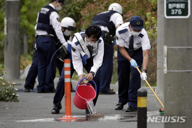 일본 흉기난동 유혈 흔적 씻어내는 경찰들