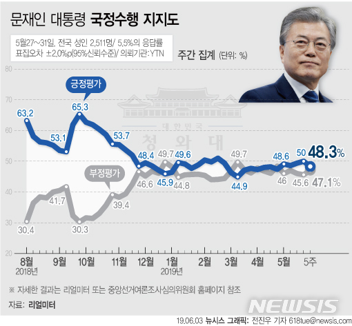 [그래픽]文 대통령 지지율 48.3%…5주 연속 긍정 (리얼미터)